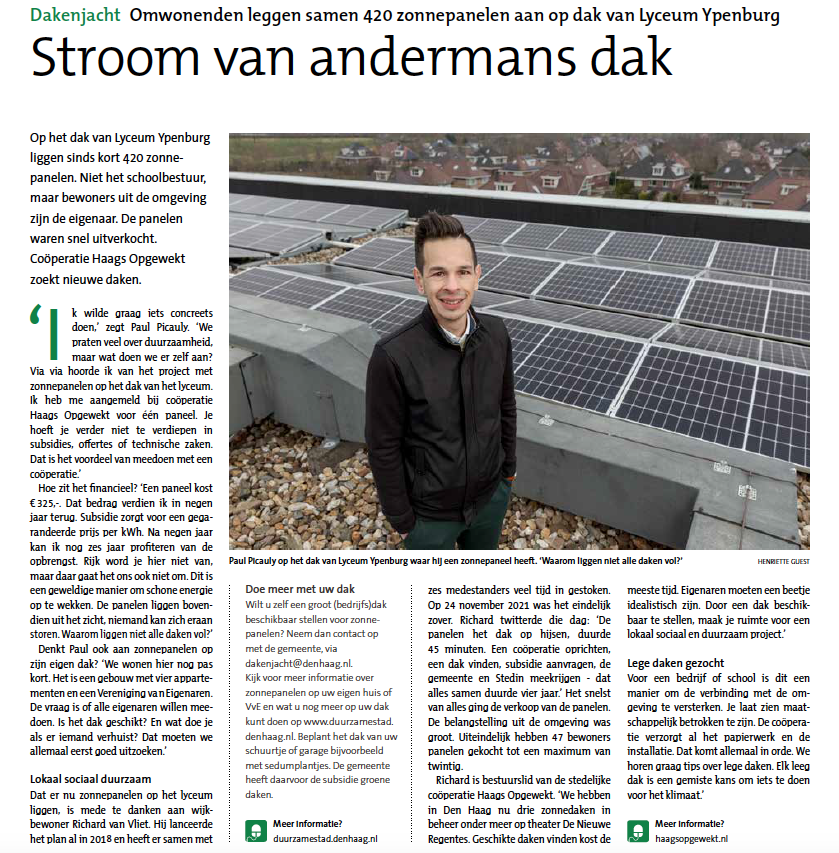 Op het dak van Lyceum Ypenburg liggen sinds kort 420 zonnepanelen. Niet het schoolbestuur, maar bewoners uit de omgeving zijn de eigenaar. Paul Picauly is eigenaar van een paneel.
